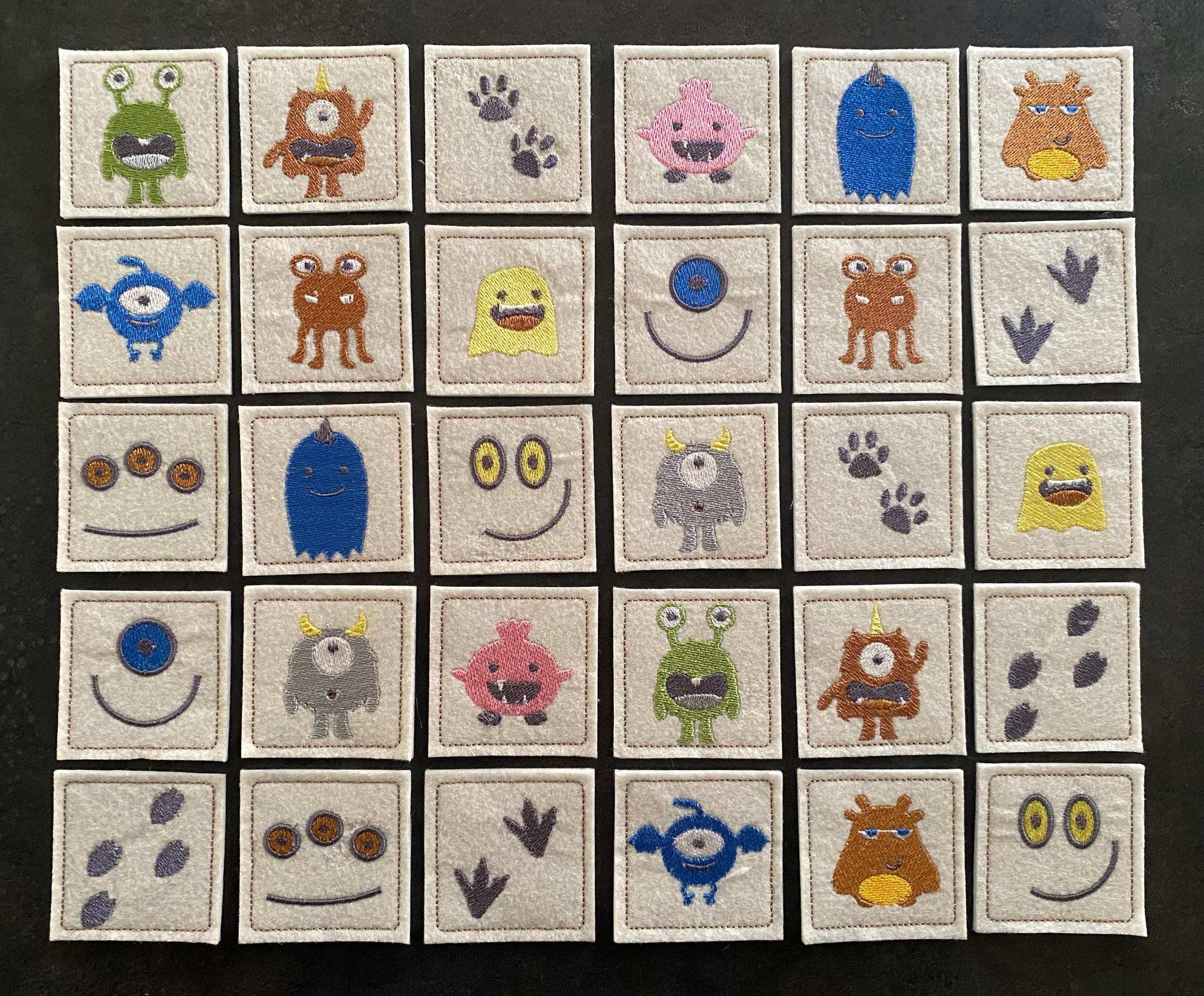 Memory game "Cute monsters" machine embroidery design In The Hoop embroidery ITH project design for 4x4, 5x7, 6x10 kids children match game