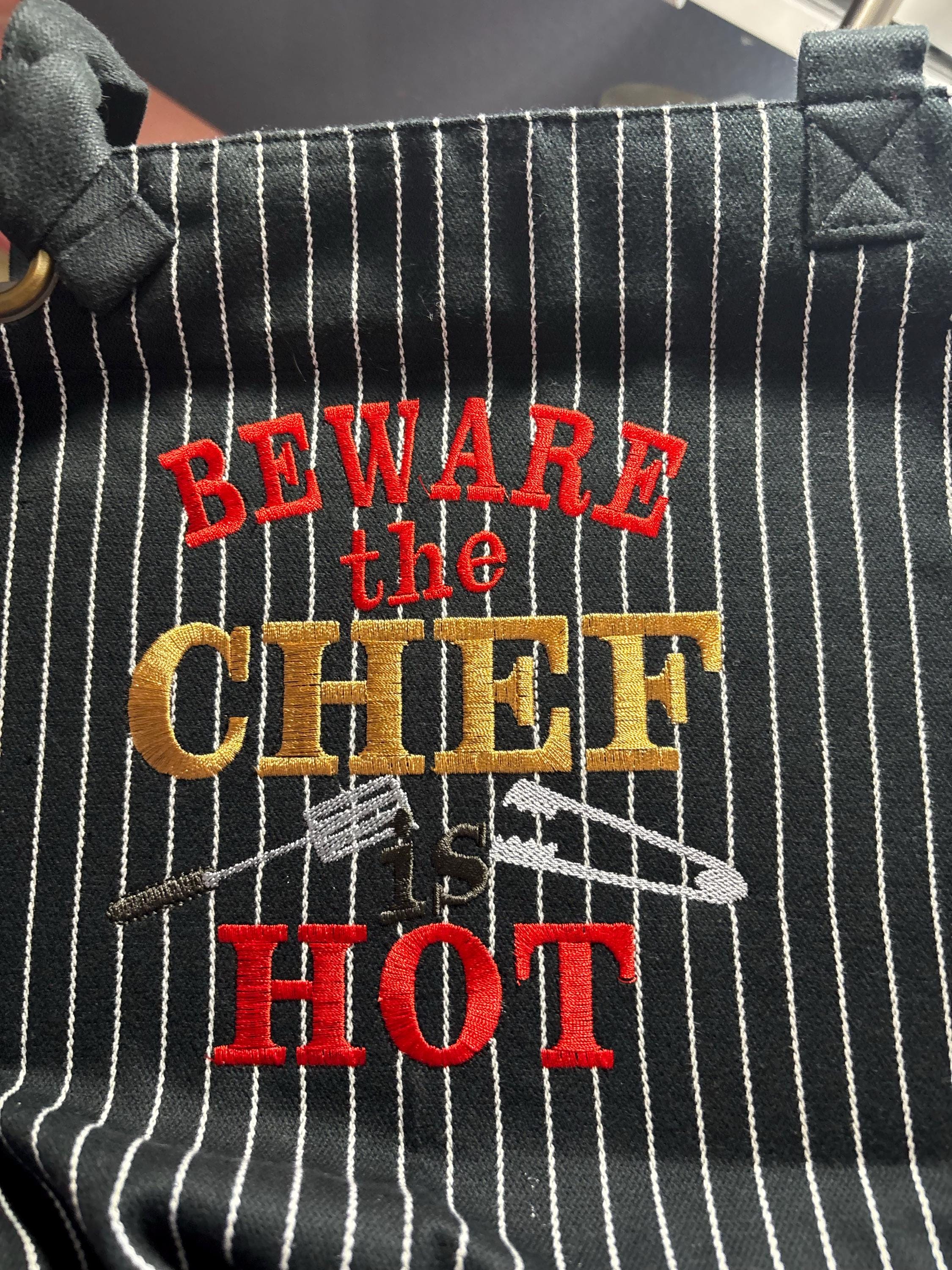 DISCOUNT 30 % Grill BBQ Beware Chef is HOT apron for men barbecue quote machine embroidery designs for towels aprons - awesome gift for him