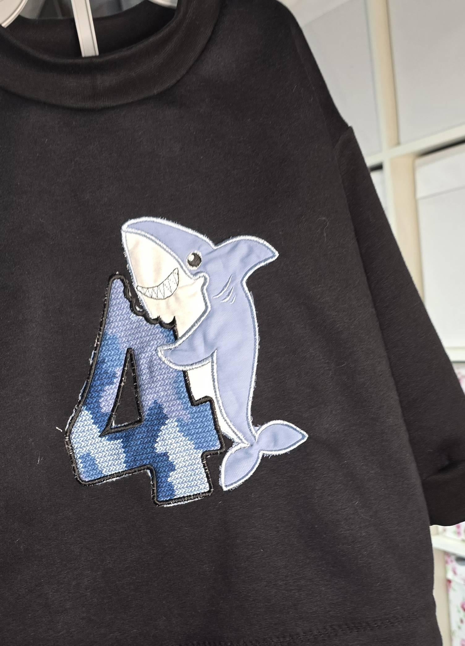 Baby Shark Birthday number 4 FOUR bitten number baby kids boy Birthday outfit design machine embroidery applique designs hoop 4x4, 5x7, 6x10