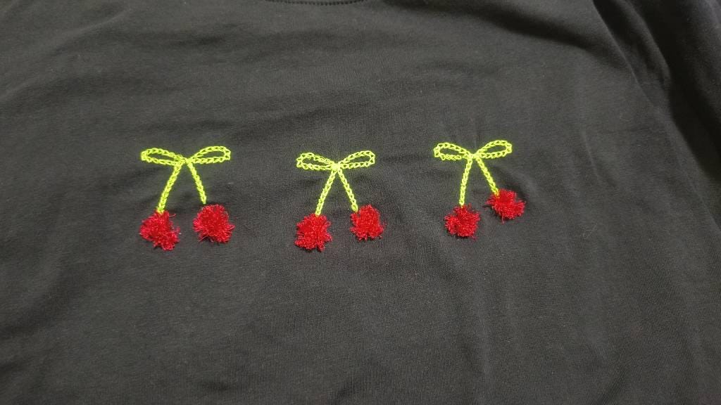 Fringed fluffy Cherry Pom Pom bow machine embroidery designs for hoop 4x4 sizes 1.5, 2, 2.5 and 3 inches awesome fringe fur pink cherry ITH