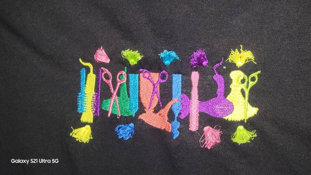 Hairstylist Hairdresser Tools and fringed tassels machine embroidery designs sizes 4, 5 and 6 inches, scissors brush hair dryer straightener