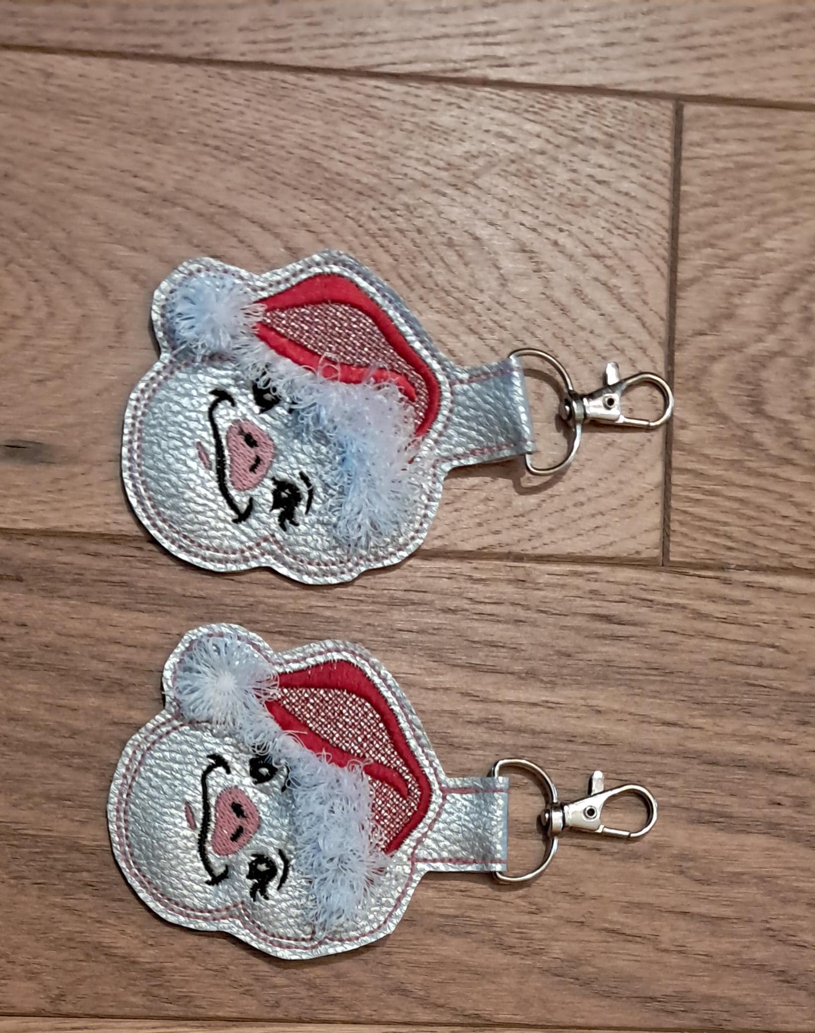 Christmas Pig fringed fluffy Santa hat key fob snap tab in the hoop machine embroidery designs Christmas farm gift idea keychain simply ITH
