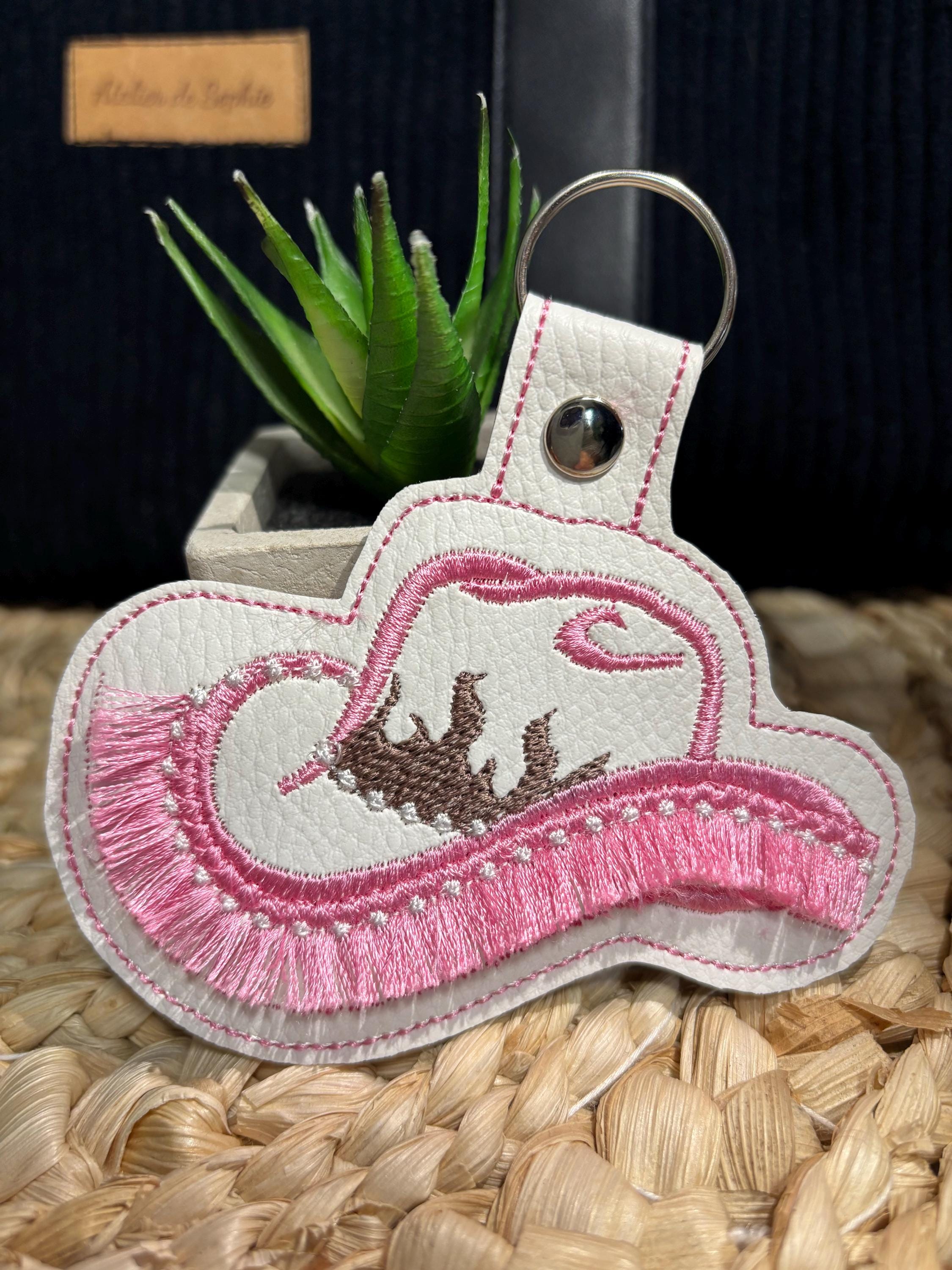 Pretty Cowgirl cowboy Boots and Hat pink key fob snap tab and Eyelet SET of 3 fringed keychain in the hoop ITH machine embroidery designs