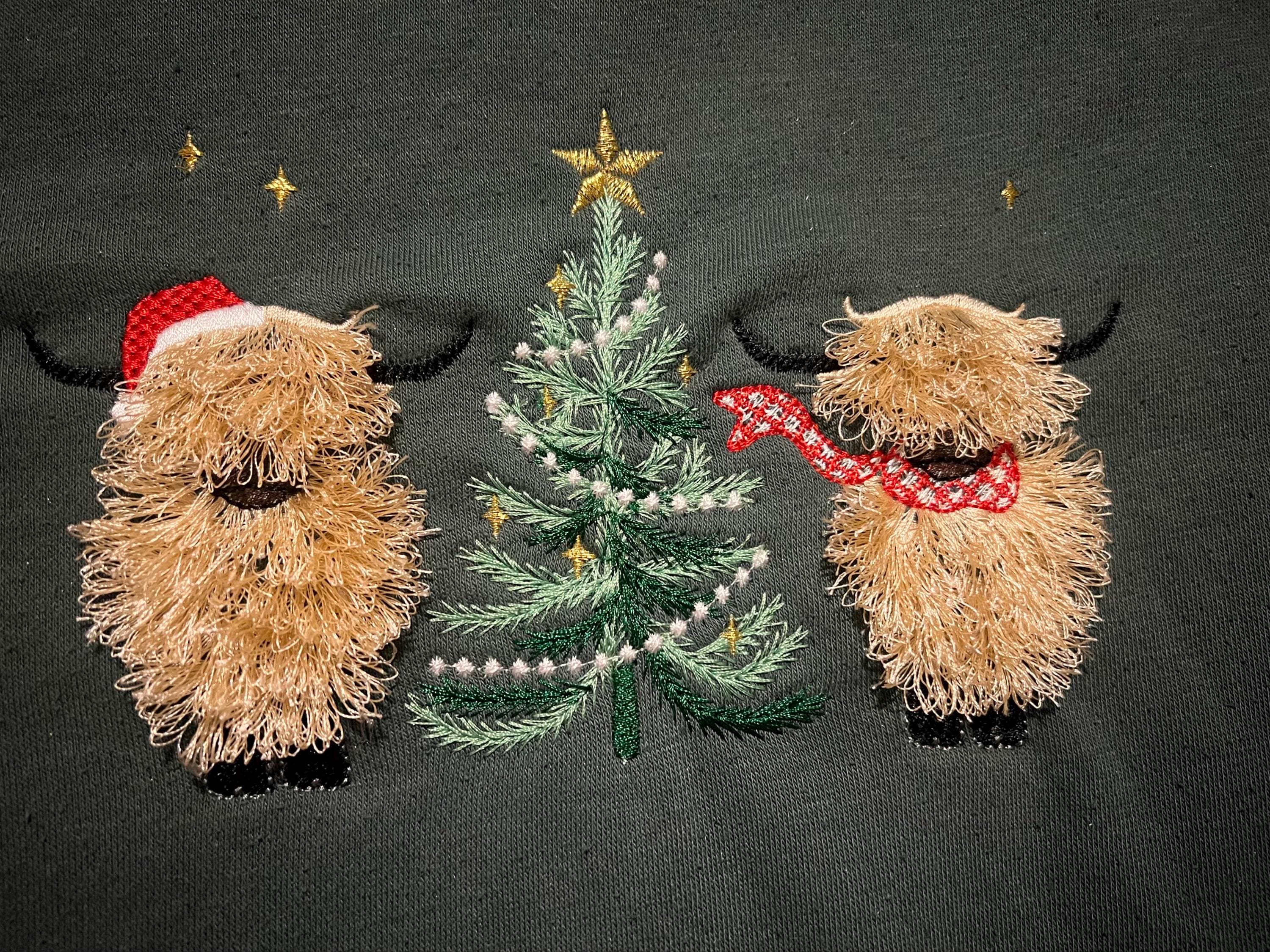 Fluffy Highland Cows with Christmas tree in a row cute fringed farm Cow machine embroidery designs awesome fringe in the hoop kids outfit