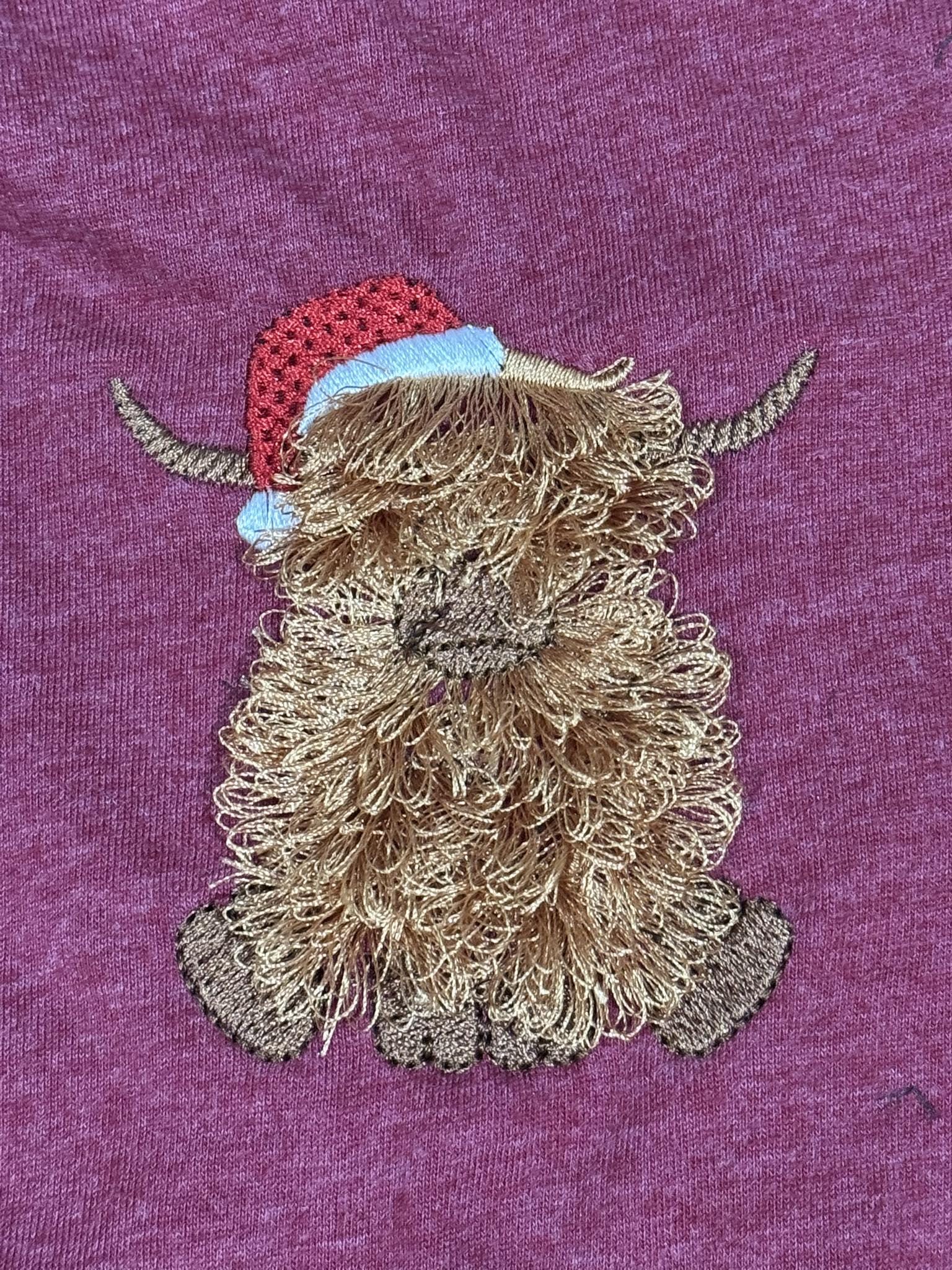 Fringed Highland Cow Christmas Santa hat Christmas Lights cute little farm animal kids machine embroidery designs fluffy fringe Bull Calf