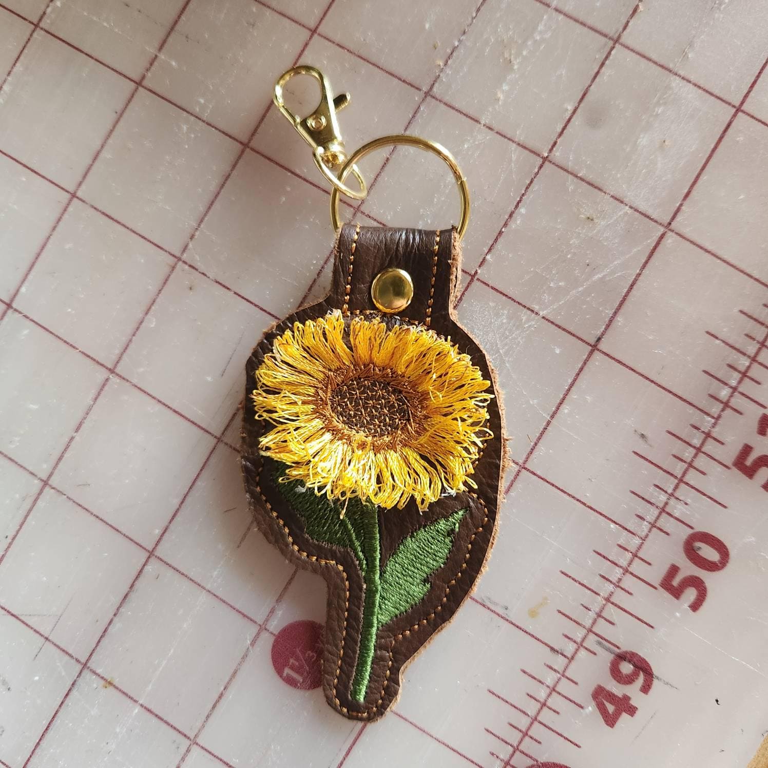 Sunflower Stem Eyelet and Key Fob Snap Tab floral keychain in the hoop machine embroidery designs ITH farm flower fluffy fringed sunflower