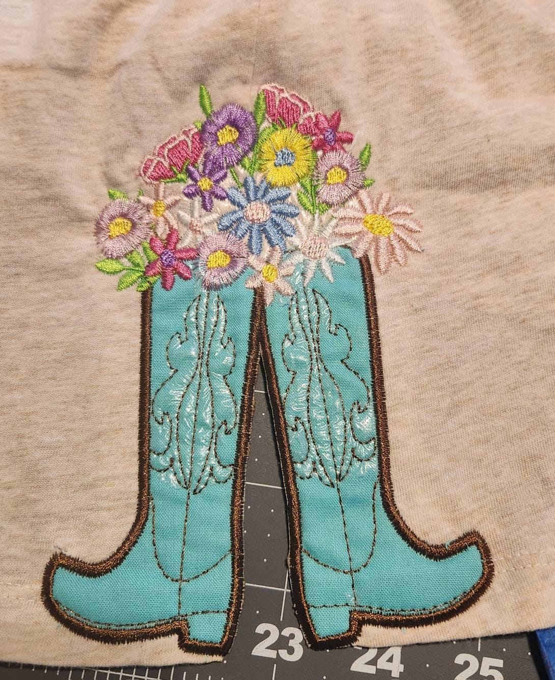🤠🌸 Elevate your wardrobe with the Cowboy Cowgirl Boots and Fringed Fluffy Flower Applique Side Cutout Split Seam embroidery design! This charming pattern features stylish cowboy boots adorned with fringed flowers, perfect for adding a girly, floral touch to sweatshirts and outfits.