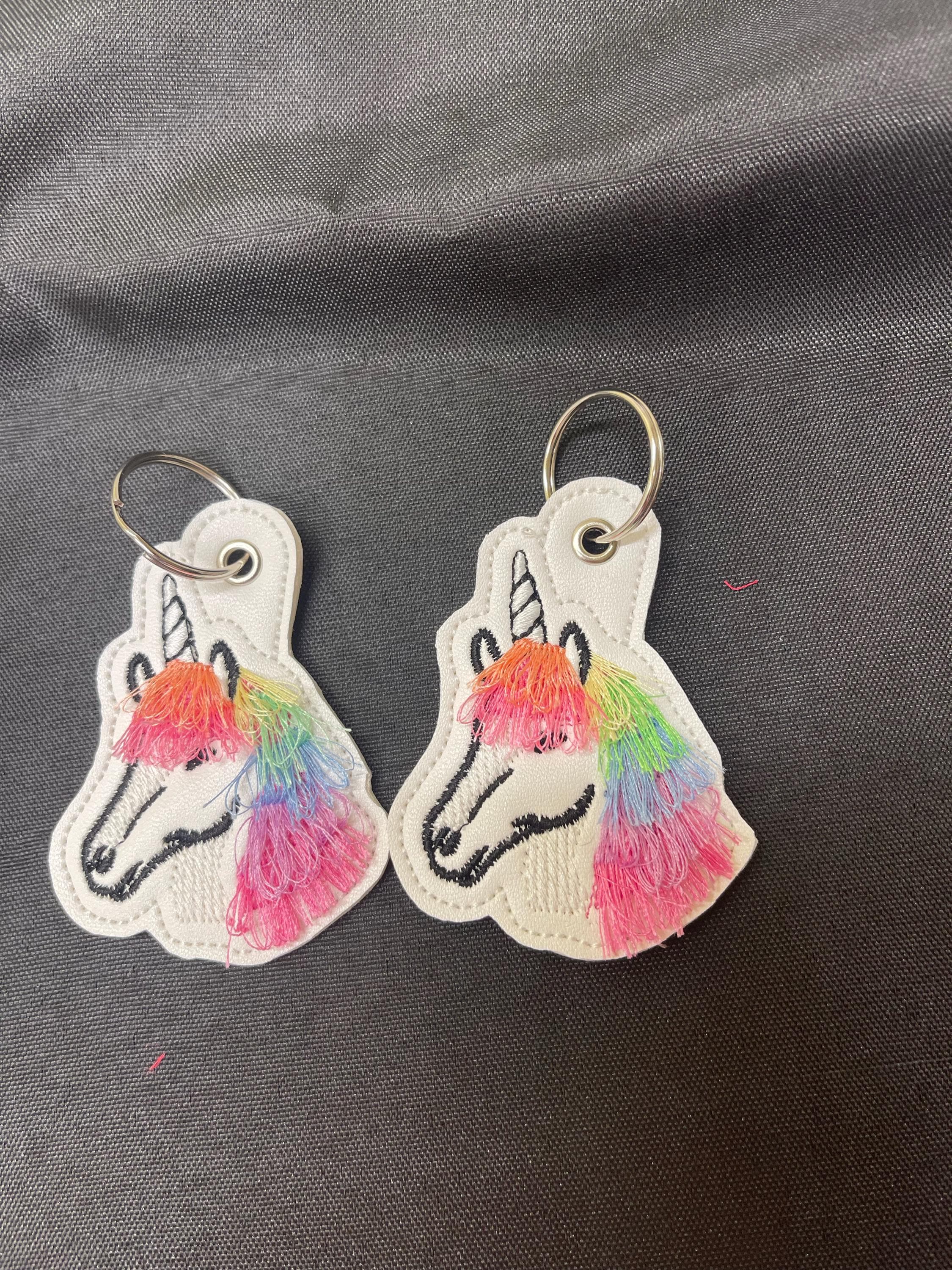 Rainbow Magic Unicorn Key Fob Snap Tab and Eyelet girls keychain in the hoop machine embroidery designs ITH project fringed fluffy fuzzy fur