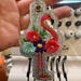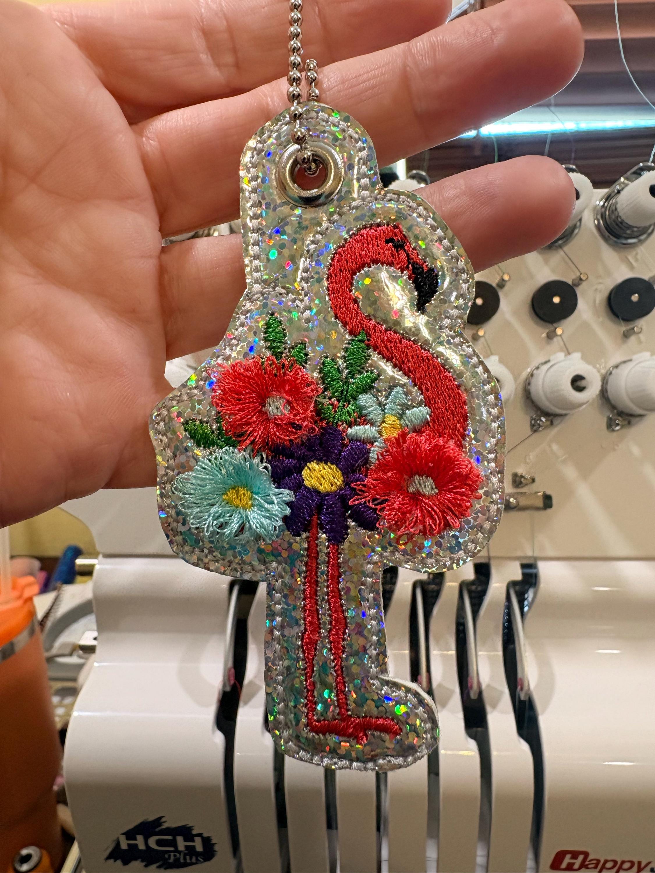 Fringed floral Flamingo Eyelet and key fob snap tab in the hoop machine embroidery designs pretty bird ITH project kids girls keychain tag