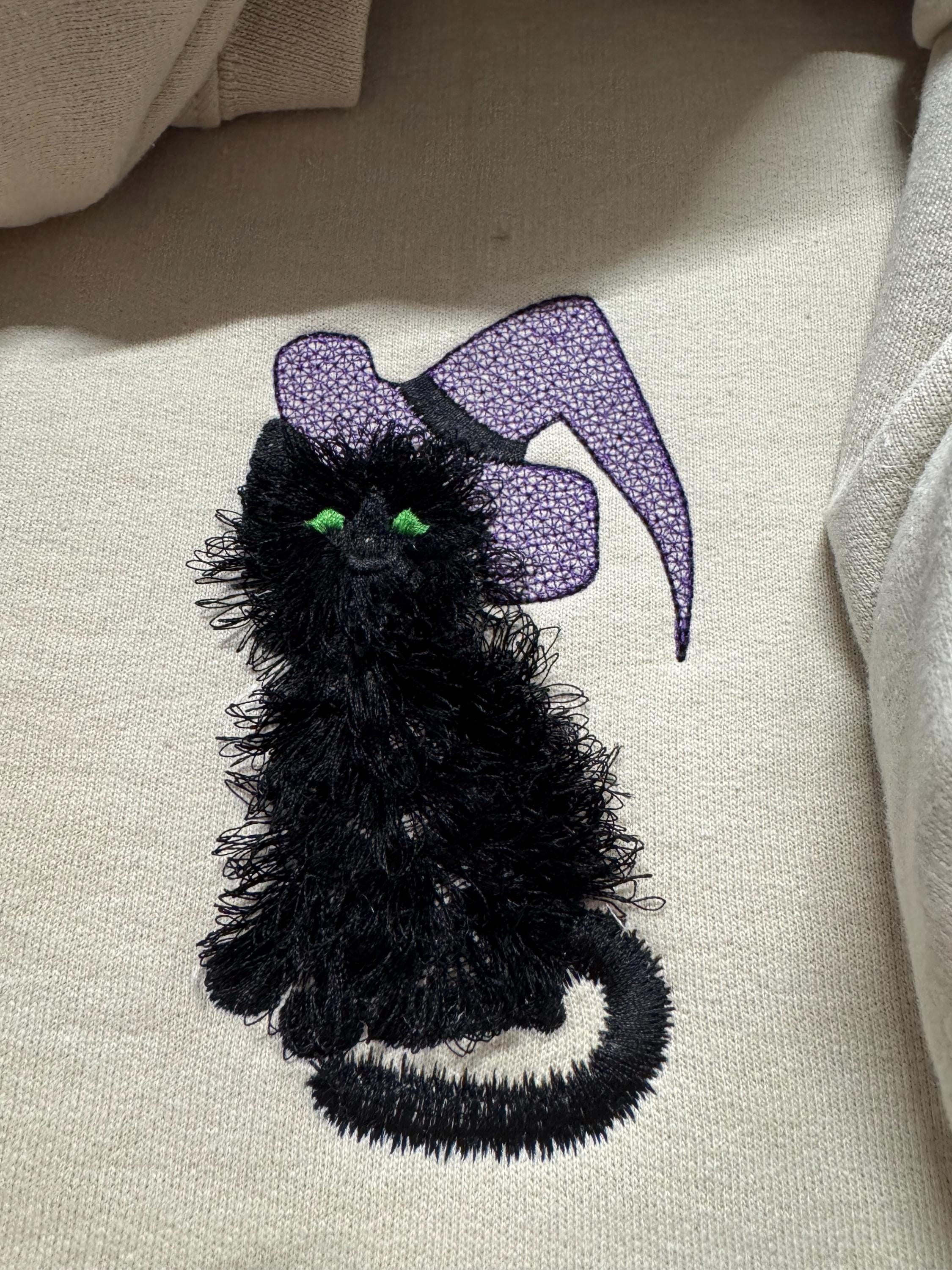 Halloween spooky Cat kitten kitty Witch Hat Fringed Fluffy Cat Fringe machine embroidery designs fuzzy fur kids design sizes 4 up to 6 inch