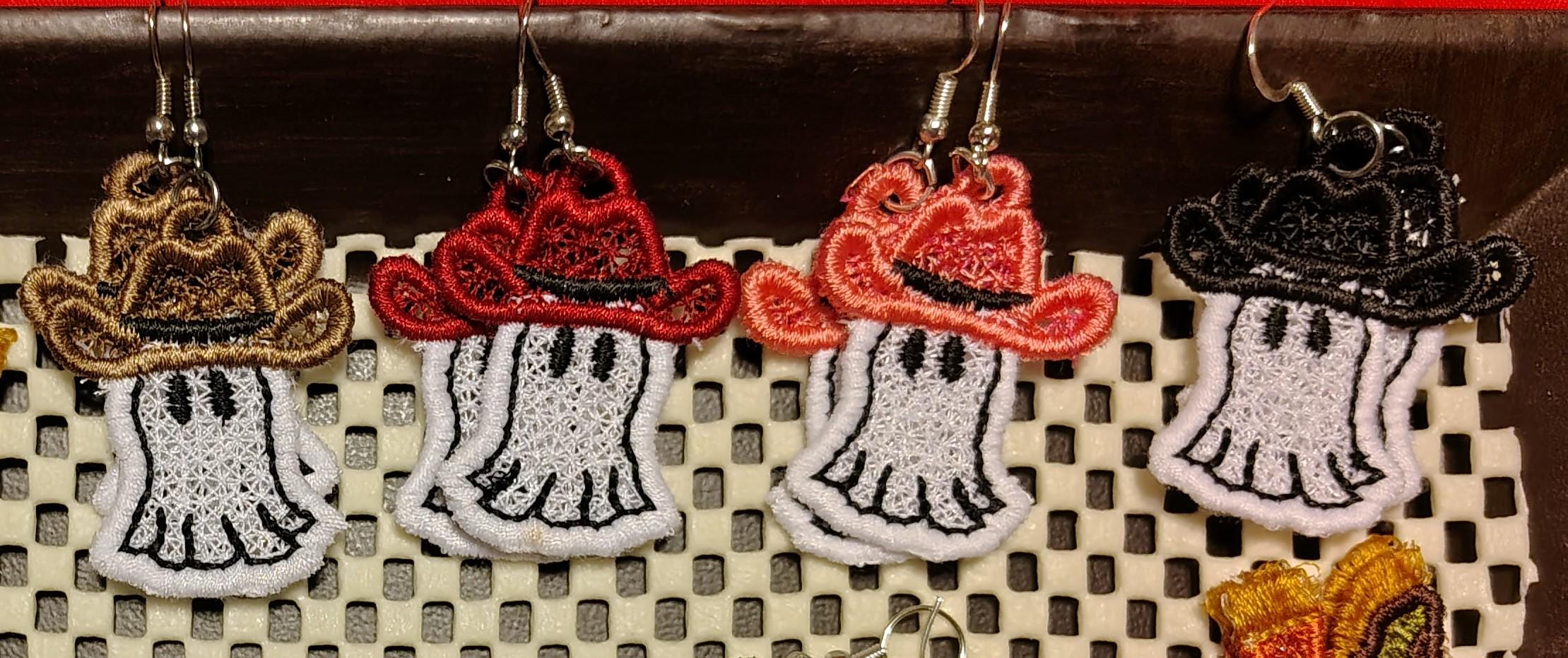 Adorable Ghost Cowboy Hat charm earrings FSL freestanding lace machine embroidery designs kids girls Halloween earrings simply in the hoop