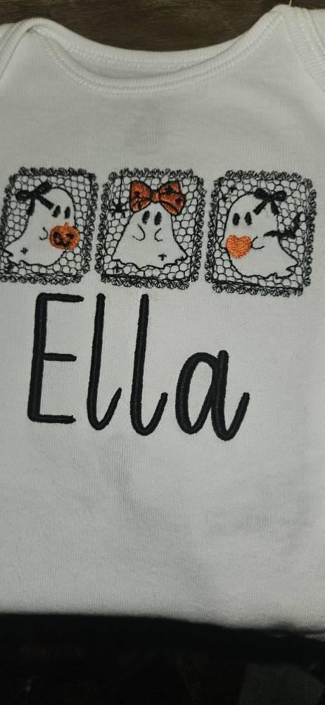 Halloween Cute Little Ghost Trio Lace effect machine embroidery designs sizes 5 up to 7 inch kids girls boys scary spooky design lace frame