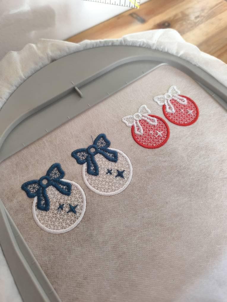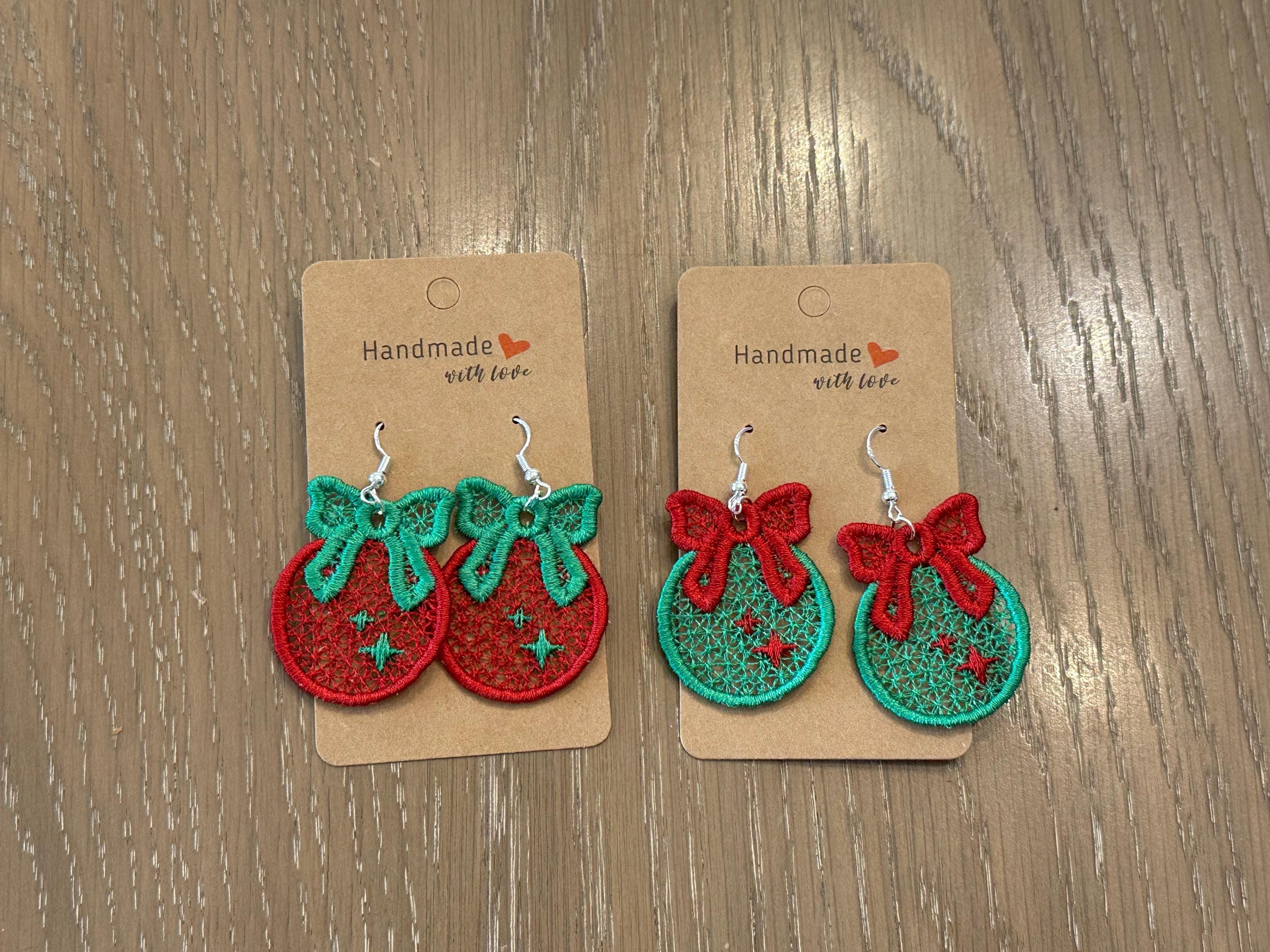 Christmas Ornament with Bow Earrings Charm or gift tag FSL freestanding lace machine embroidery designs girls earrings simply in the hoop