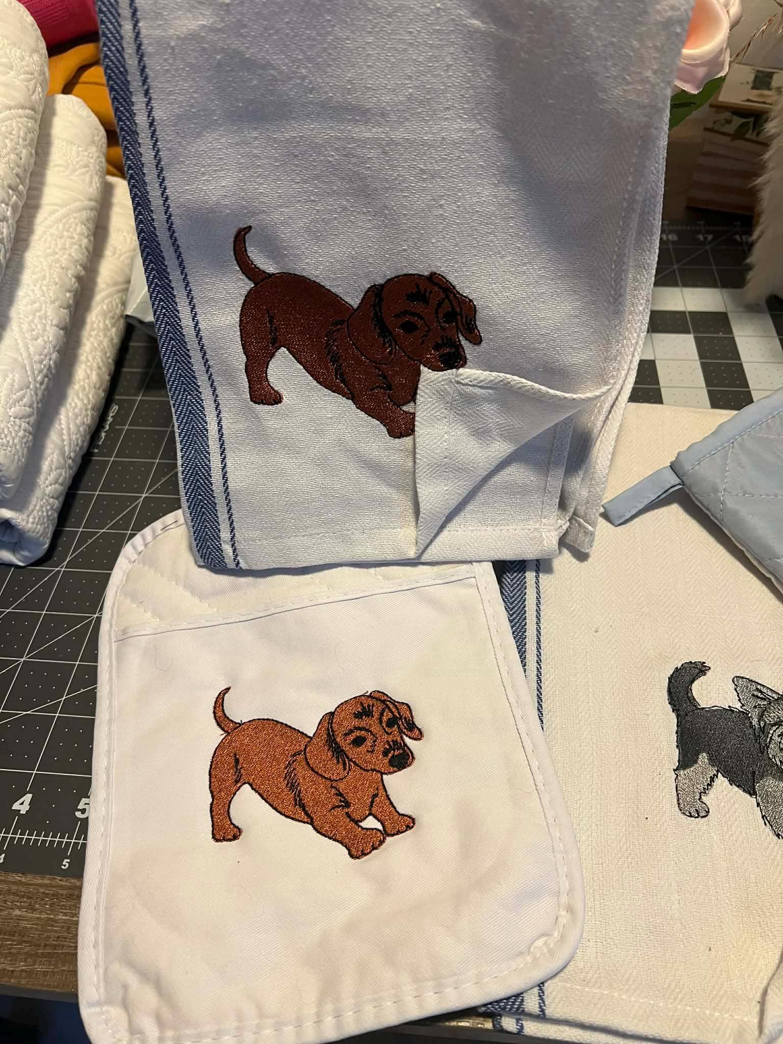 Lovely playing Dachshund Puppy Dog Mama kitchen dish towel pet animal kids machine embroidery designs ITH project simply in the hoop project